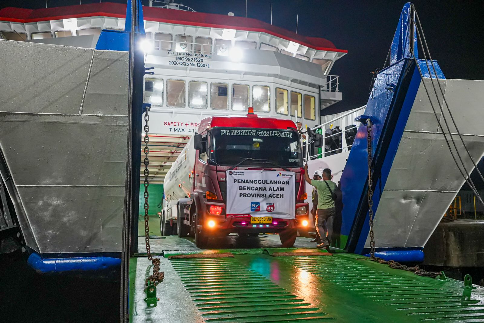 Ketibaan Skid Tank LPG dan Armada Tambahan Mobil Tangki di Pelabuhan Ulee Lheue, Aceh yang dikirimkan melalui jalur laut untuk mempercepat pemulihan pasokan BBM dan LPG di Aceh pada Jumat malam (5/12).--Dok Pertamina Patra Niaga