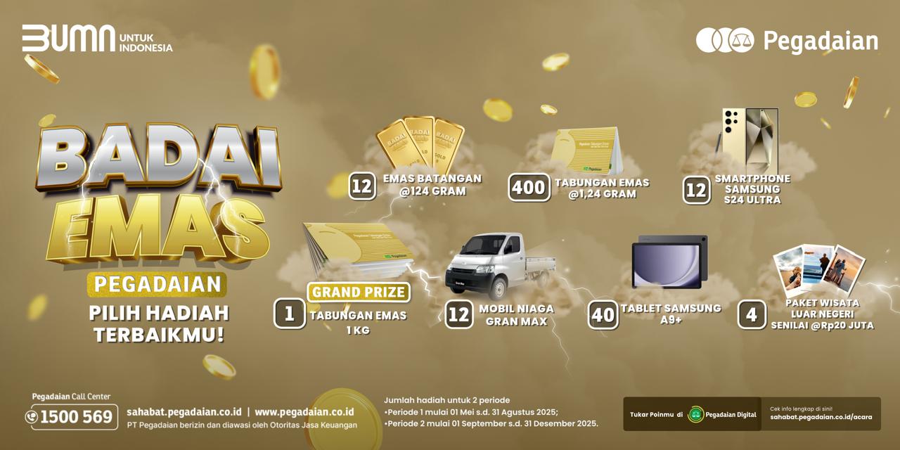 Undian Badai Emas Pegadaian 2025, Hadiah Grand Prize Tabungan Emas 1 Kg hingga Paket Haji Plus--Dok Pegadaian