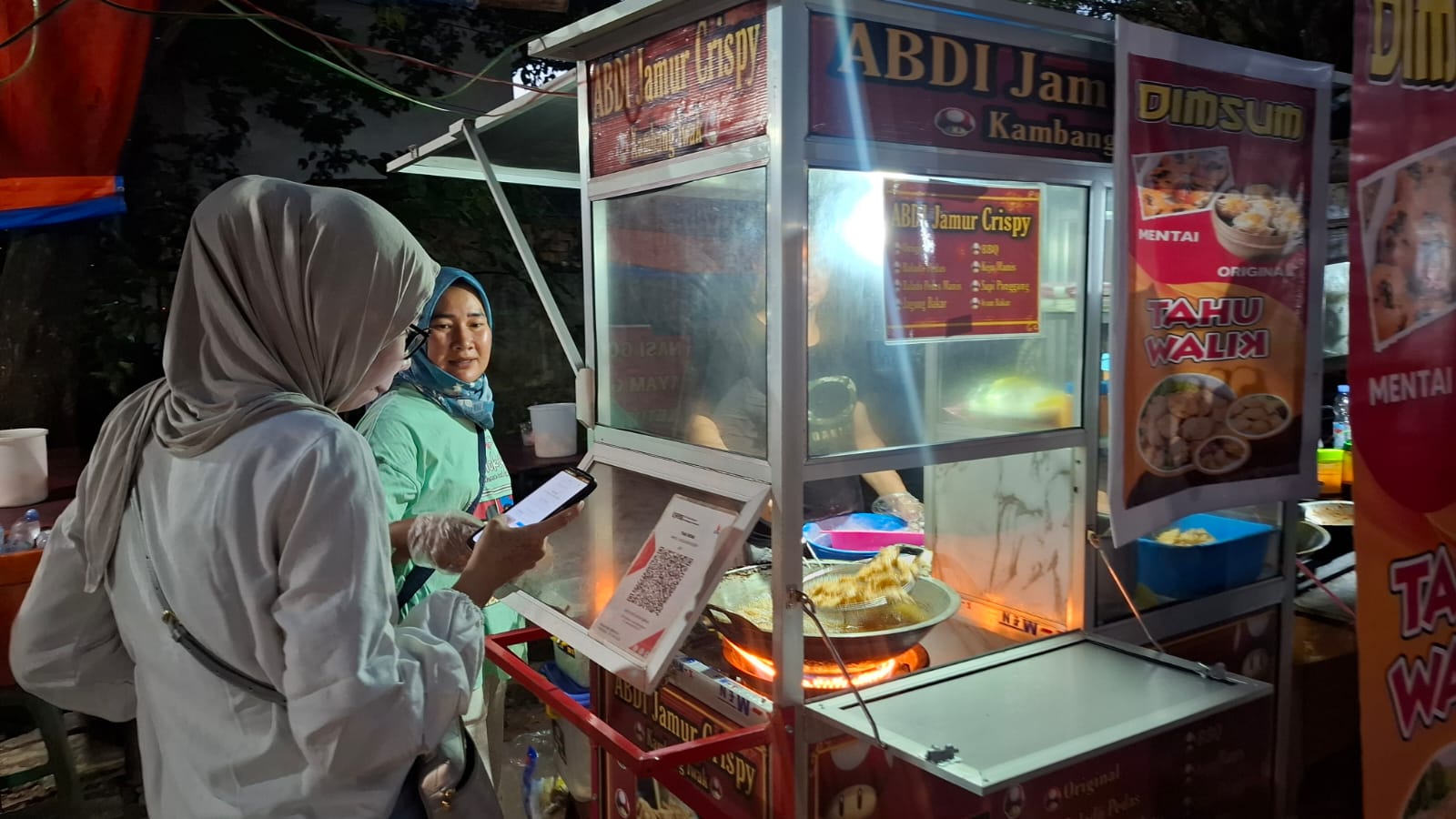 Saat menghampiri Sapta, gerobak Jamur Crispy Sapta sedang ramai yang mengantre untuk membeli, beberapa diantaranya membayar dengan QRIS.