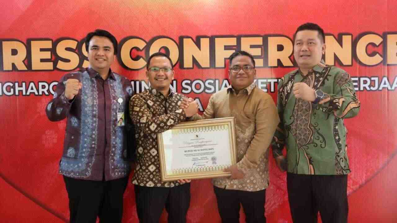 Penghargaan tersebut diterima oleh Asisten Bidang Pemerintahan dan Kesejahteraan Rakyat Sekretariat Daerah Kabupaten Muba, Ardiansyah SE MM PhD CMA, bersama Kepala Dinas Ketenagakerjaan Muba, Herryandi Sinulingga AP, dan Kepala BPJS Ketenagakerjaan Cabang Muba dan Banyuasin, Ahmad Nizam Farabi.