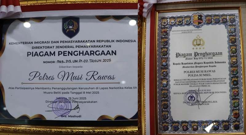 Selain itu Polres Musi Rawas juga menerima penghargaan dari Dirjen Pemasyarakatan (Dirjenpas), atas partisipasi membantu penanggulangan kerusuhan di Lembaga Permasyarakatan Narkotika Kelas IIA Muara Beliti.