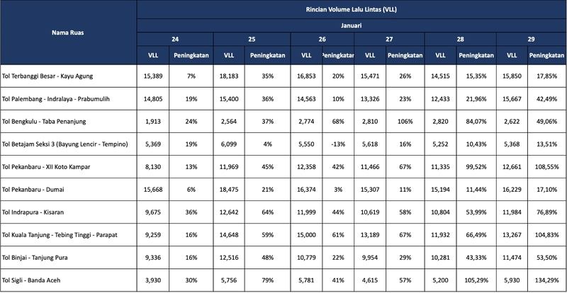 Rincian Volume Lalulintas yang melalui Ruas Jalan Tol Trans Sumatera priode 24 hingga 29 Januari 2025.-Hutama Karya-