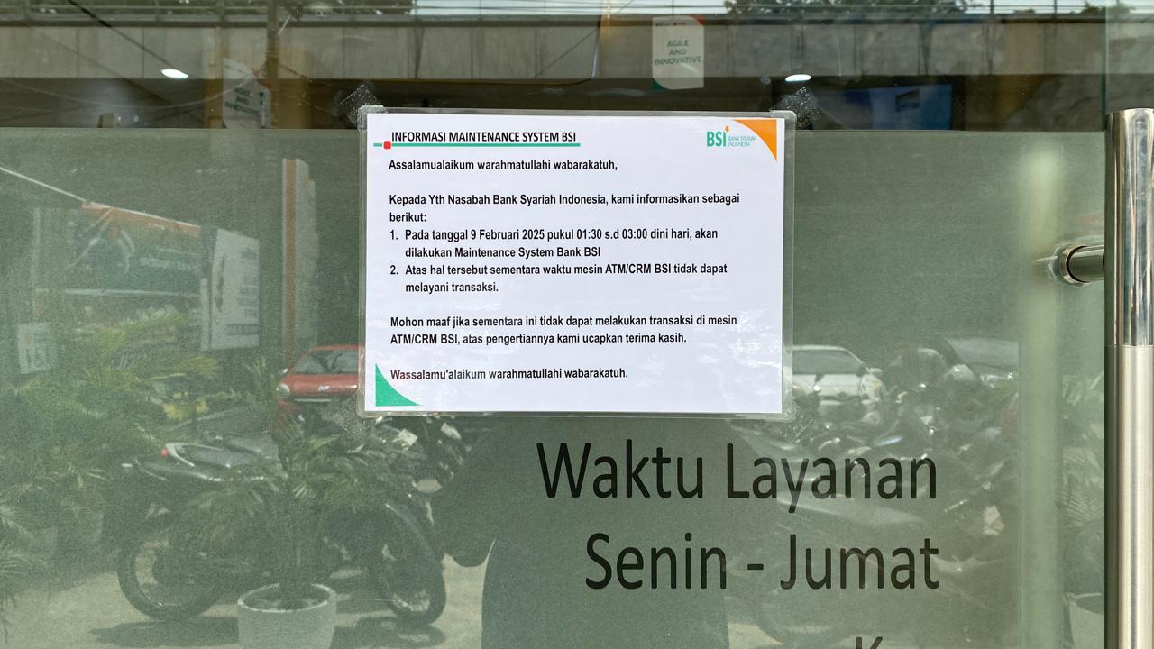 Pengumuman layanan gangguan BYOND By BSI tertera di pintu ATM-Palpres.com-Alhadi Farid