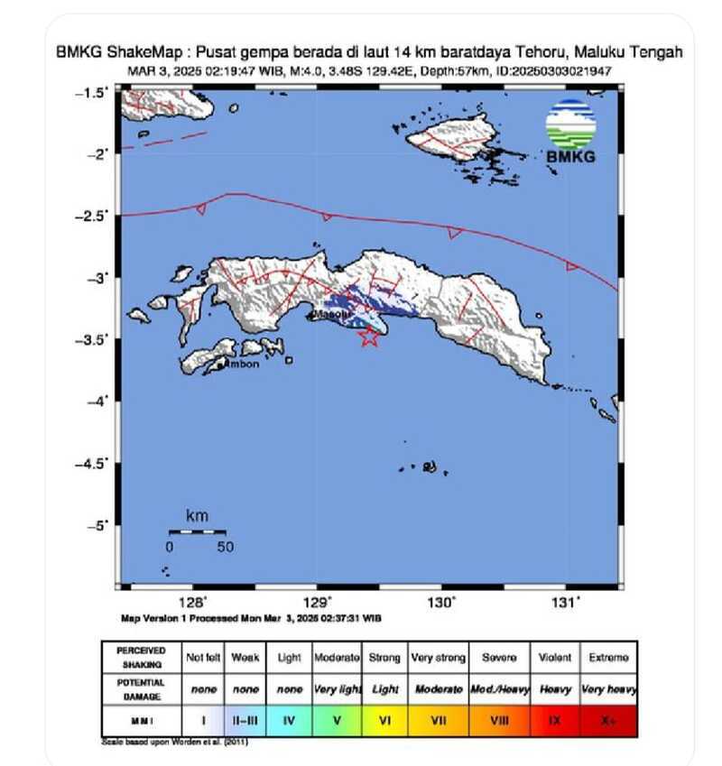 Gempa berkekuatan 4.0 Magnitudo dirasakan di Maluku Tengah pada pukul 02:19:47 WIB-@infobmkg-