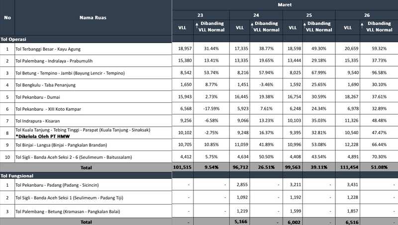 Total VLL di ruas Jalan Tol Trans Sumatera pada 26 Maret 2025 mencapai 111.454 kendaraan.