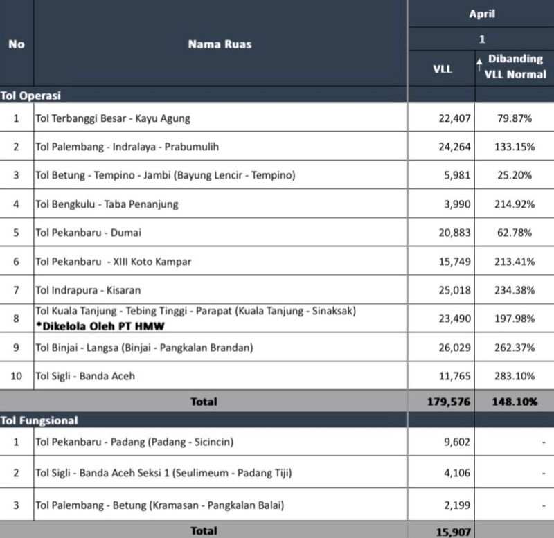 Tol Pekanbaru – Dumai, VLL 20.883, Peningkatan 62,78 persen.