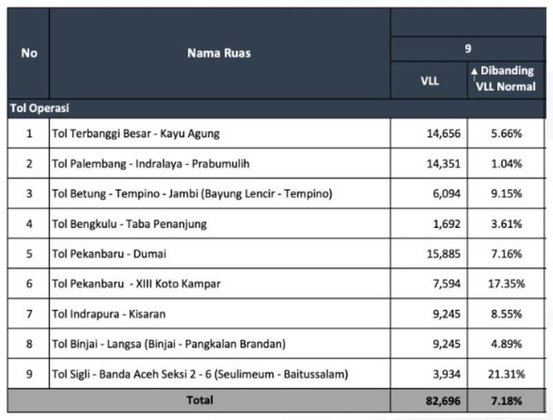 Tol Betung – Tempino – Jambi (Bayung Lencir – Tempino) VLL 6.094, Peningkatan dibanding VLL Normal 9,15 persen.