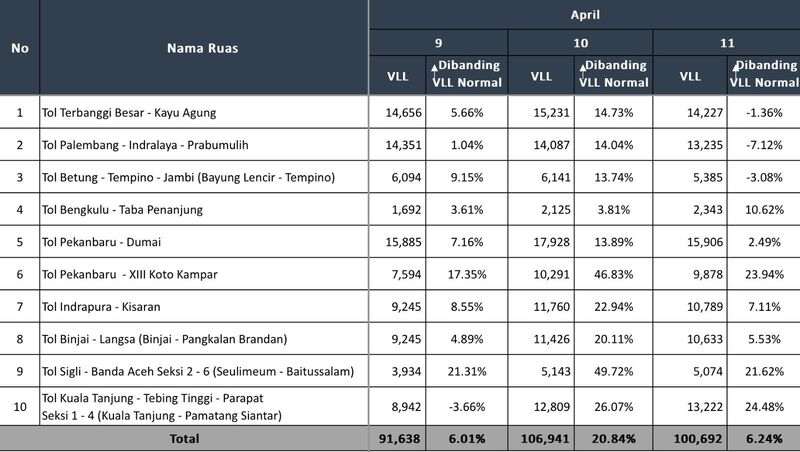 Tol Kuala Tanjung – Tebing Tinggi - Prapat Seksi 1 – 4 (Kuala Tanjung – Pematang Siantar), VLL 13.222, Peningkatan dibanding VLL Normal 24,48 persen.