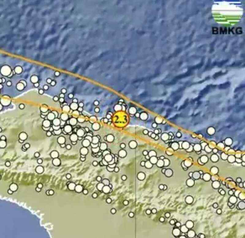 Gempa 2.3 Magnitudo sekitar pukul 02:47:32 WIB terjadi di Papua, tepatnya di Kabupatem Jayapura, pada koordinat 2.41LS, 140.54BT.-IG@infobmkg-