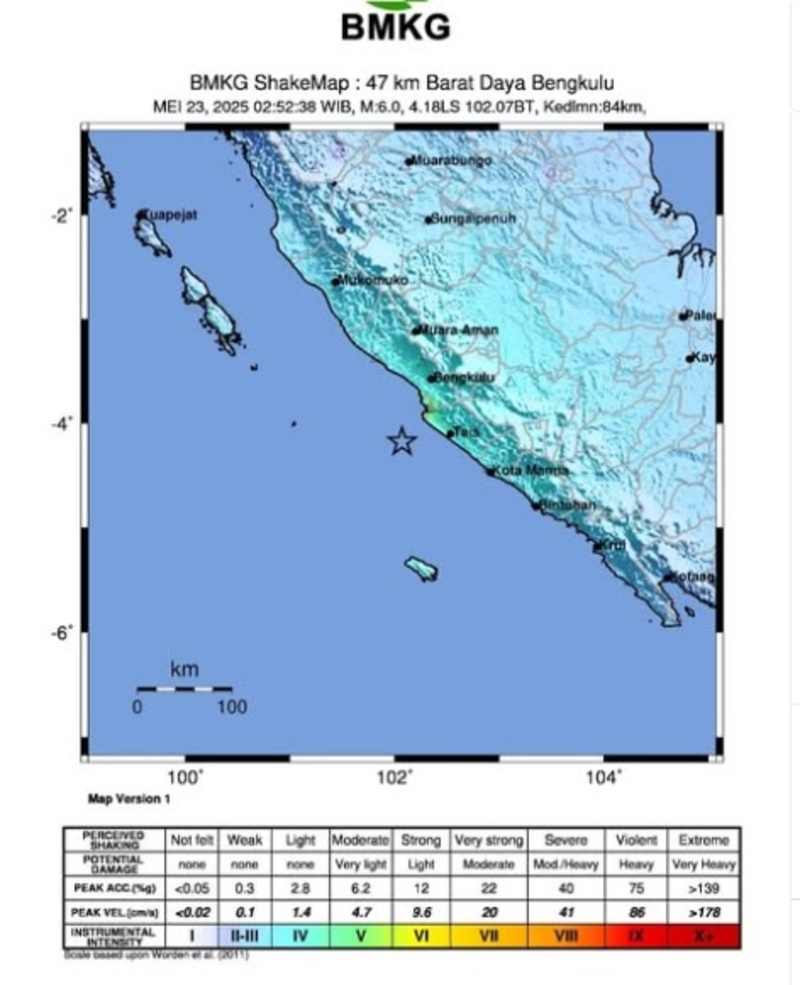 Gempa yang mengguncang Provinsi Bengkulu pada pukul 02.52.37 WIB wilayah Pantai Barat Daya merupakan gempa tektonik di wilayah Pantai Barat Daya Kota Bengkulu.-IG@infobmkg-