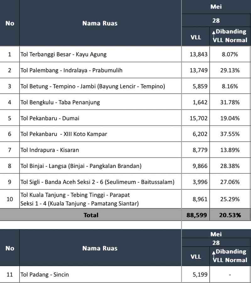 Tol Indrapura – Kisaran, VLL 8.779, Peningkatan dibanding VLL Normal 13,89 persen.