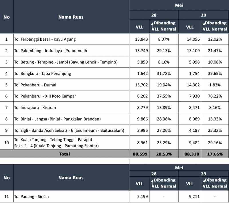 Tol Palembang – Indralaya – Prabumulih, VLL 13.109, Peningkatan dibanding VLL Normal 21,47 persen.