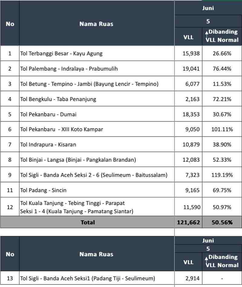 Rincian trafik Jalan Tol Trans Sumatera pada periode libur panjang, 5 Juni 2025-Hutama Karya-