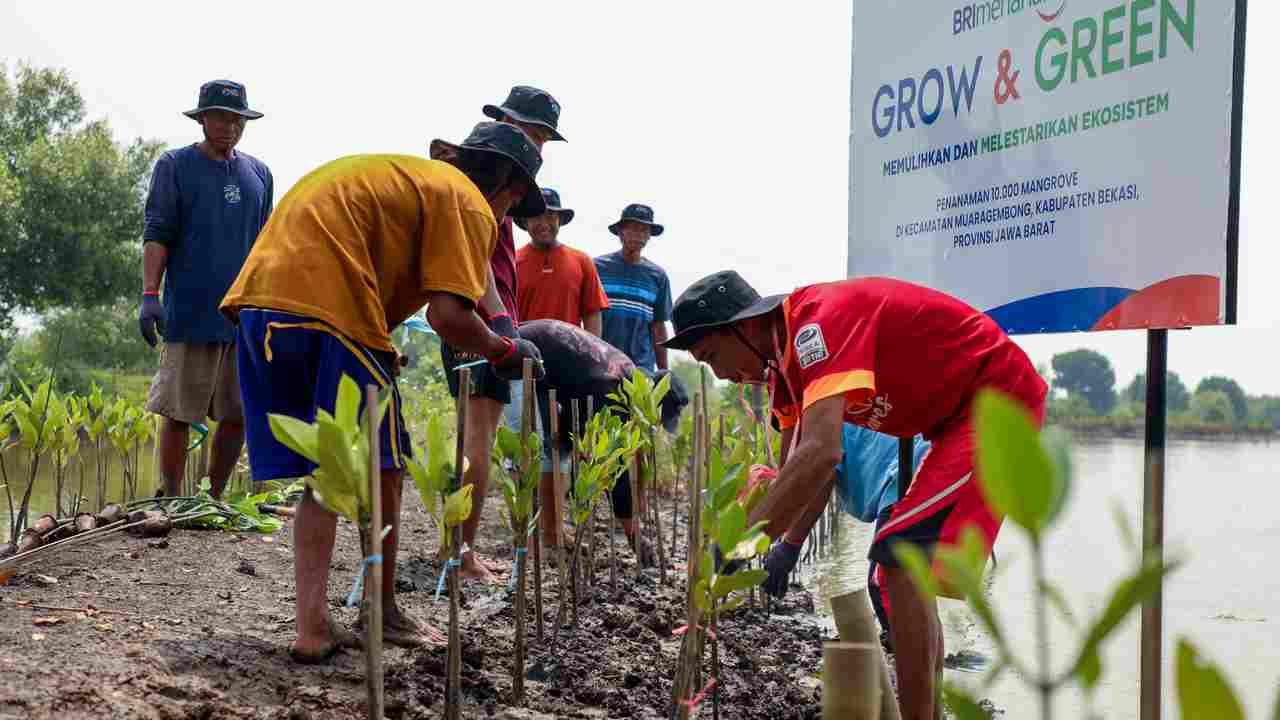 BRI kembali menegaskan komitmennya terhadap keberlanjutan lingkungan melalui BRI Menanam - Grow & Green, berupa penanaman 10.000 pohon Mangrove di kawasan pesisir Muara Gembong, Kab.Bekasi, Jawa Barat.-BRI-