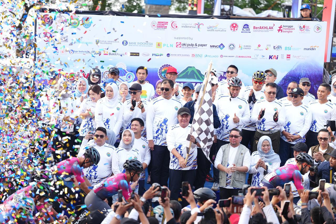 Gubernur Herman Deru mengibarkan bendera start tanda dimulainya perlombaan balap sepeda Sriwijaya Gran Fondi 2025, di OKU Selatan.-humas pemprov sumsel-