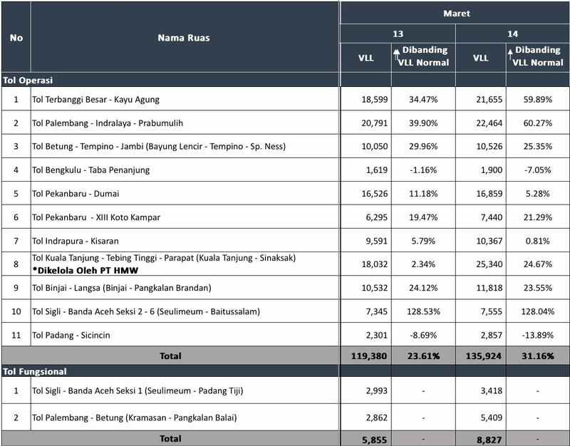 SUMATRA, PALPRES.COM – Memasuki periode Mudik Lebaran 2026, 14 Maret 2026, total trafik harian pada ruas tol yang telah beroperasi tercatat mencapai 135.924 kendaraan.