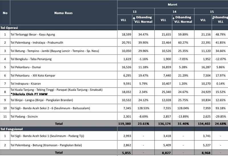 Secara kumulatif, total trafik harian pada ruas tol yang telah beroperasi tercatat mencapai 134.402 kendaraan, meningkat 24,68% dibandingkan trafik normal.