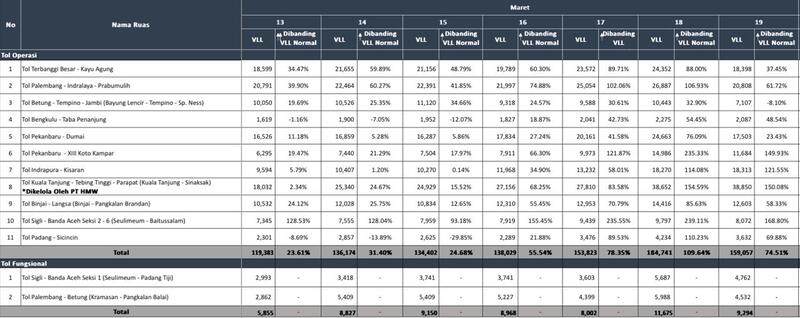 Rekap Trafik Harian Ruas Tol Beroperasi (Periode 19 Maret 2026):