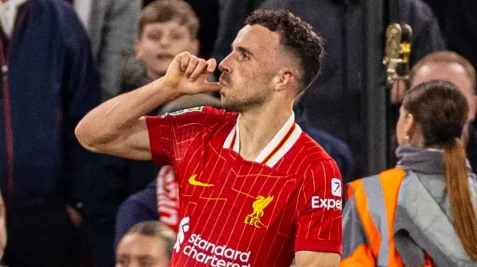 Pemain Liverpool, Diogo Jota, melakukan selebrasi usai mencetak gol--diogoj_18