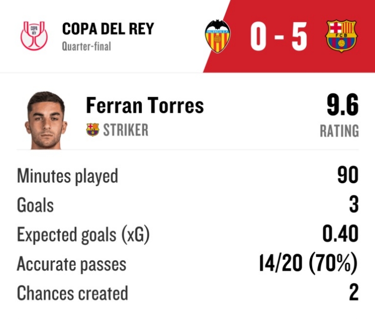 Catatan Ferran Torres saat Barcelona bermain melawan Velencia di Copa del Rey--fotmob