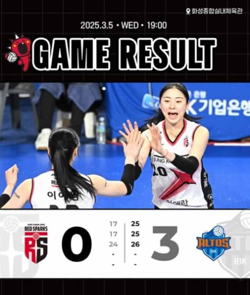Pada laga yang berlangsung di Hwaseong Indoor Arena, Hwaseong, Korea Selatan, Red Sparks dipaksa menyerah 0-3 (17-25, 17-25, 24-26) tanpa balas atas IBK Altos.-IG@red__sparks-