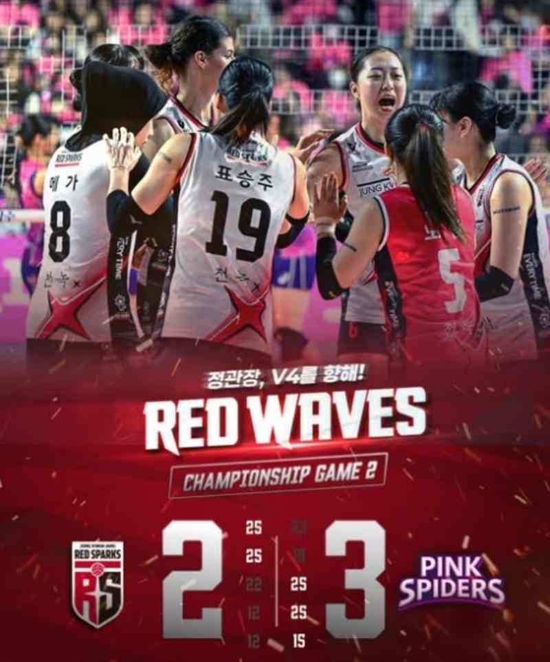 Sempat unggul 2-0, Red Sparks malah kena comeback Pink Spiders. Dengan kekalahan kedua ini, Red Sparks sementara tertinggal 0-2 atas Pink Spiders.-IG@red_sparks_ina-