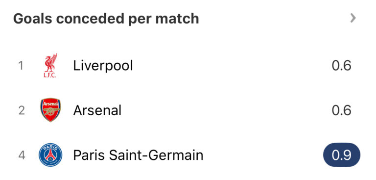 PSG hanya kemasukan 0.9 gol per pertandingan di Liga Champion musim ini, dengan hanya Arsenal, Liverpool, dan Inter Milan yang kemasukan lebih sedikit.