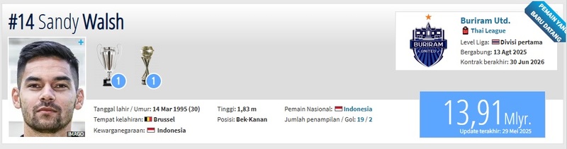 Bahkan, nama Sandy Walsh juga telah didaftarkan Buriram United dan kini tercantum di situs resmi Thai League.