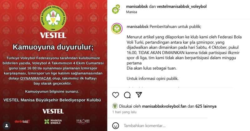 Pengumuman pembatalan laga antara Manisa BBSK kontra Imzirspor Kulubu yang akan berlangsung hari ini, Sabtu 4 Oktober 2025. Laga dibatalkan karena Imzirspor Kulubu mundur dari Kadinlar 1 Ligi.-IG@manisabbsk-