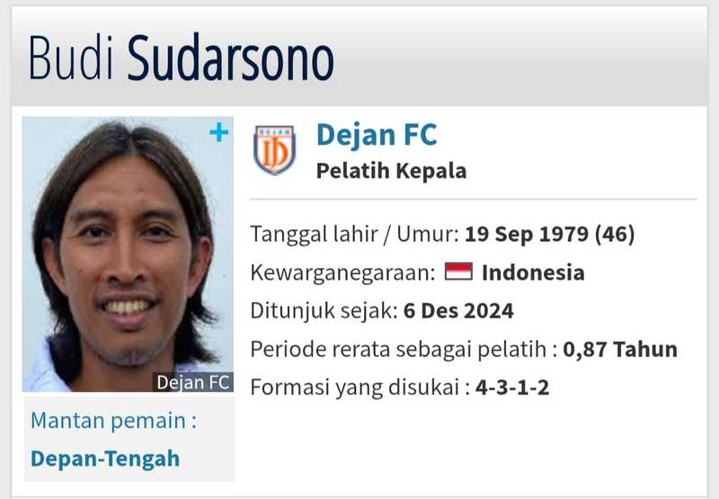 Selepas pensiun bagai Pelatih, Budi Sudarsono sempat melatih sejumlah klub, salah satunya Dejan FC.-transfermarkt.co.id-