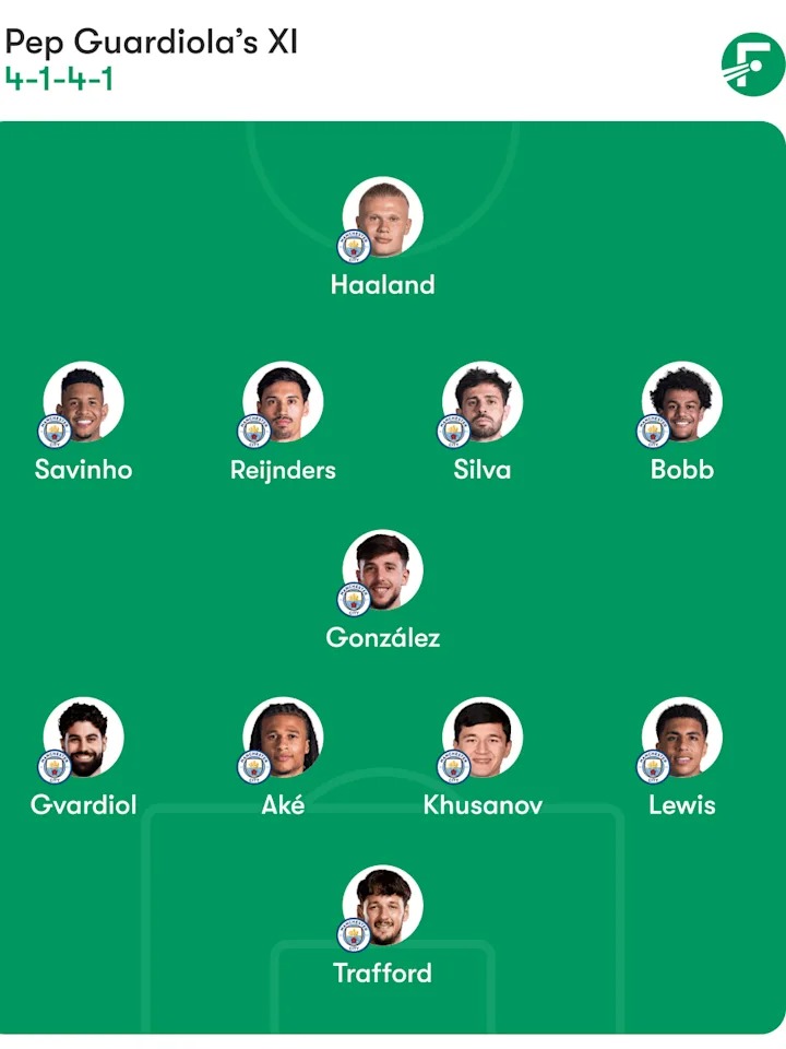 Prediksi susunan pemain Manchester City (4-1-4-1): Trafford; Lewis, Khusanov, Aké, Gvardiol; González; Bobb, Silva, Reijnders, Savinho; Haaland.