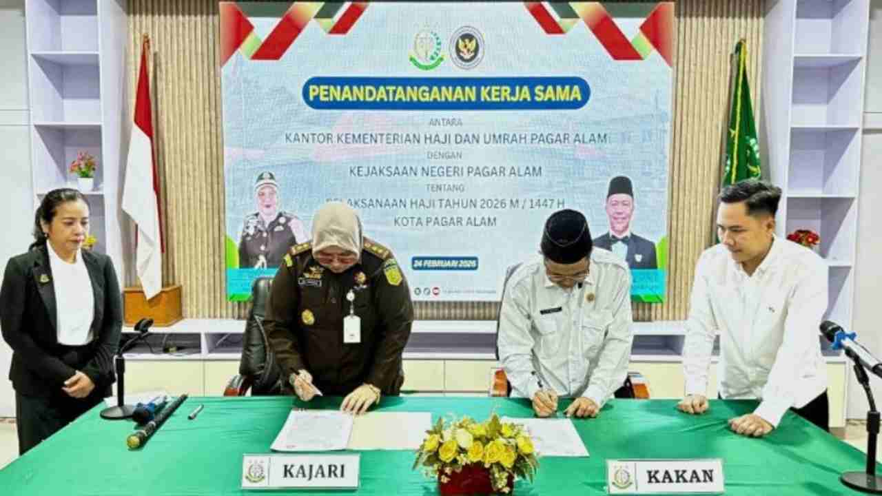 PAGAR ALAM, PALPRES.COM – Kepala Kejaksaan Negeri Pagar Alam, Dr. Ira Febrina, S.H., M.Si., melaksanakan penandatanganan Perjanjian Kerja Sama (MoU) dengan Kepala Kantor Kementerian Haji dan Umrah Kota Pagar Alam, H. Silahudin, S.Ag., M.Pd.I., Selasa 24 Februari 2026.