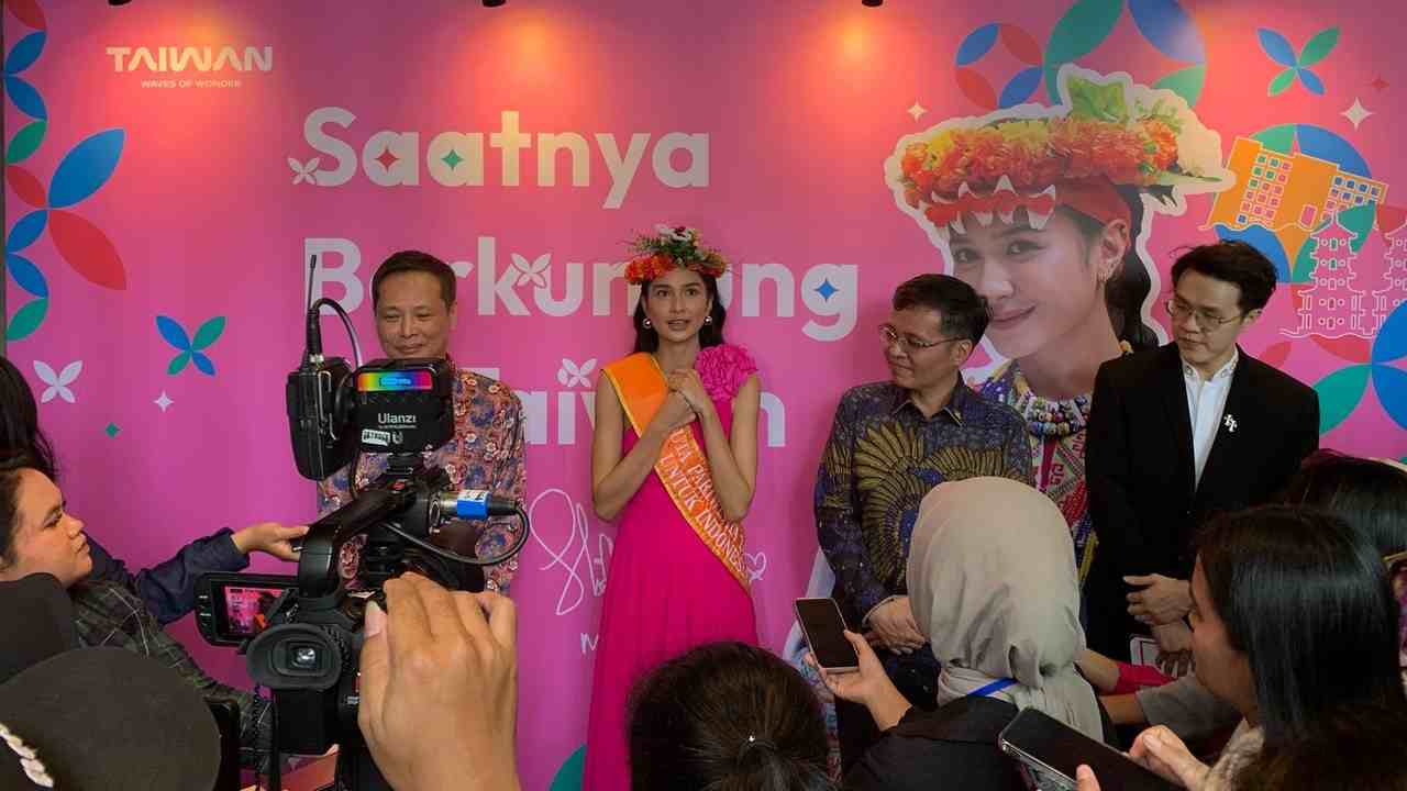 Duta Pariwisata Taiwan Pertama di Indonesia Mikha Tambayong, bersama Direktur Dinas Pariwisata Taiwan saat sesi wawancara disela-sela konferensi pers peluncuran video promosi pariwisata Taiwan di Jakarta--SMSI
